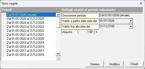 Adeguamento del software alle disposizioni contenute nel Decreto del Ministero dell'Economia e delle Finanze del 10 dicembre 2025 (GU n. 289 del 13-12-2025) in virtù del quale il saggio degli interessi legali è stato modificato, a partire dal 1° gennaio 2026, dal 2% all'1,6% con conseguente modifica: