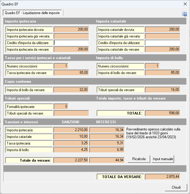 È stata introdotta la possibilità di specificare l'importo dell'imposta di successione versata in sede di precedenti dichiarazioni già al momento dell'esecuzione della funzione Calcoli | Liquidazione imposte. In tal modo il calcolo dell'eventuale ravvedimento operoso terrà conto della sola imposta ancora da versare.