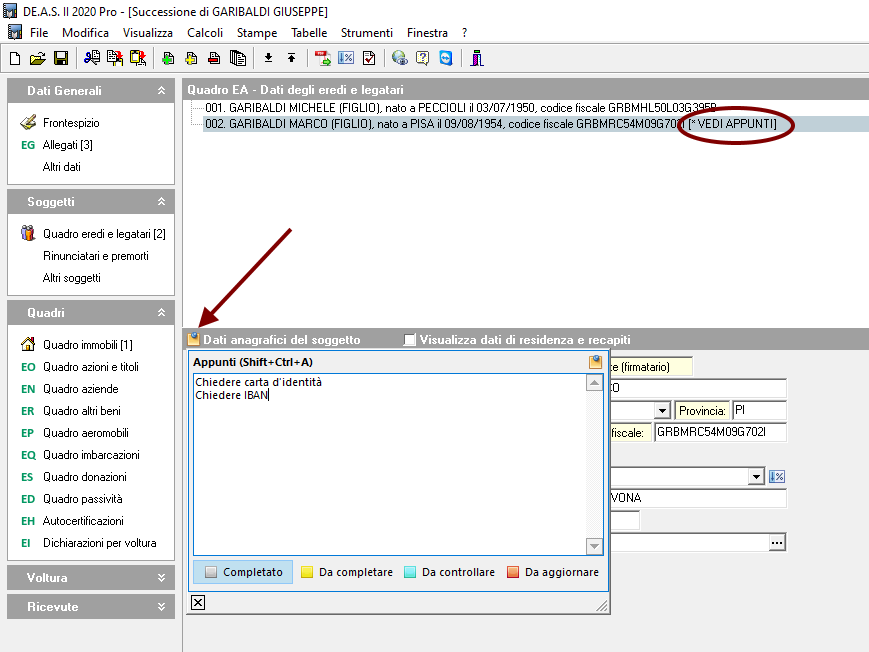 Oltre alle righe di osservazioni vere e proprie, che poi possono essere stampate sotto forma di dichiarazione sostitutiva da allegare alla successione (vedi Note e osservazioni), DE.A.S. permette anche di inserire degli appunti per: