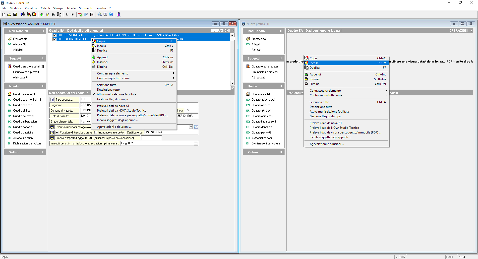 - Selezionare i soggetti (o gli immobili, i cespiti ecc.) che si vogliono copiare e con il tasto destro del mouse eseguire il comando Copia (in alternativa, usare la combinazione di tasti