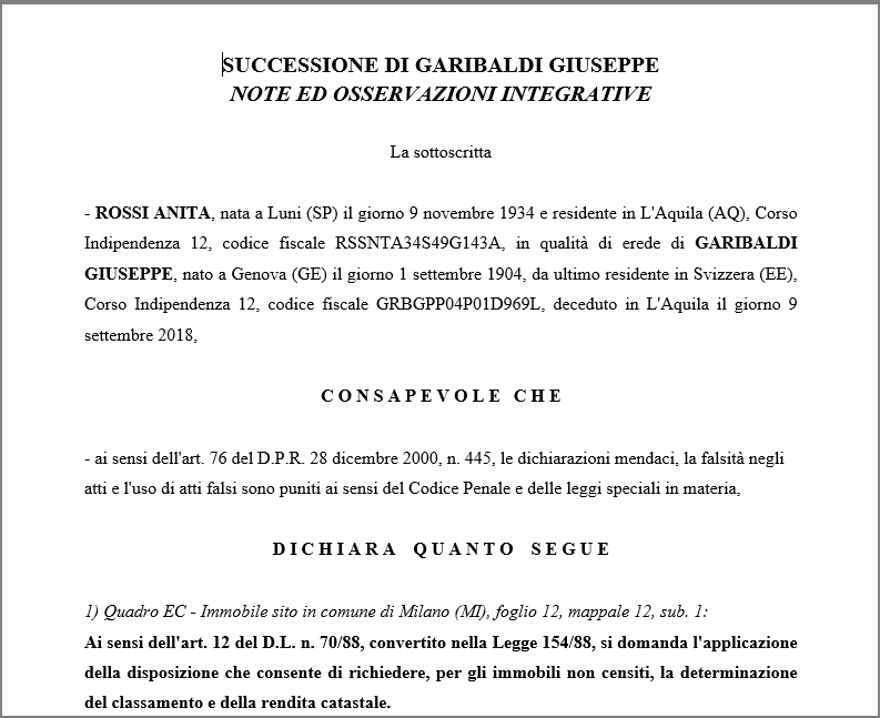 DE.A.S. permette comunque di inserirle in un apposito campo Note ma esse non saranno stampate all'interno della dichiarazione di successione.