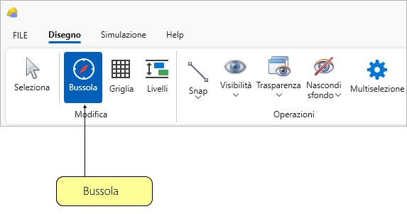 La funzione denominata Bussola, accessibile dalla scheda Disegno, permette di visualizzare o nascondere lo strumento per l'orientamento.