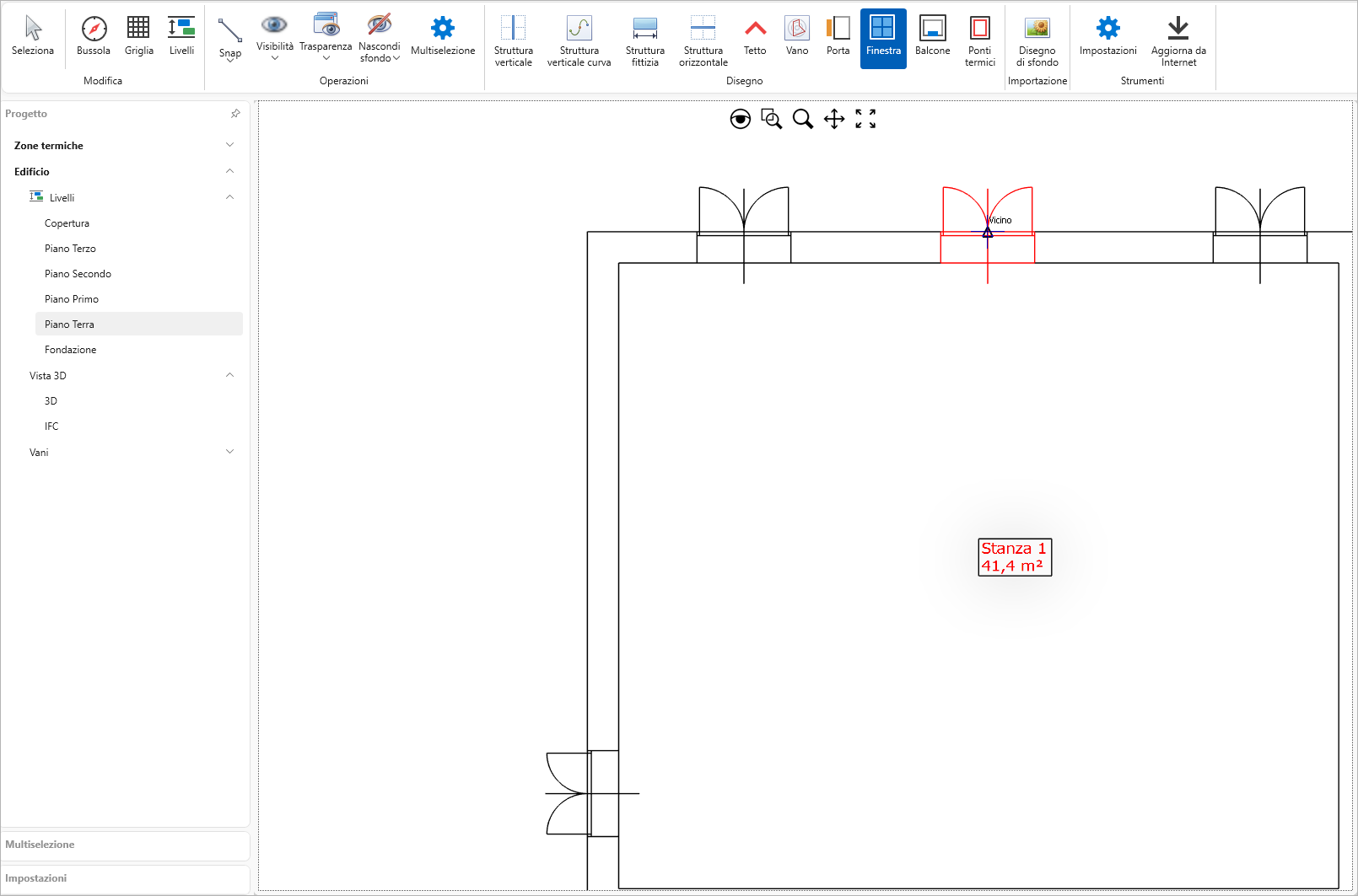 Per creare una finestra, una volta premuto il relativo pulsante, è sufficiente fare click, nella visualizzazione in 2D, sulla parete di destinazione della finestra.