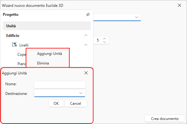Successivamente sarà possibile inserire ulteriori unità, tramite il comando Aggiungi unità, associato al tasto destro del mouse. Per ognuna di esse è necessario specificare un nome e la destinazione (es: Appartamenti, Negozi, Uffici...).