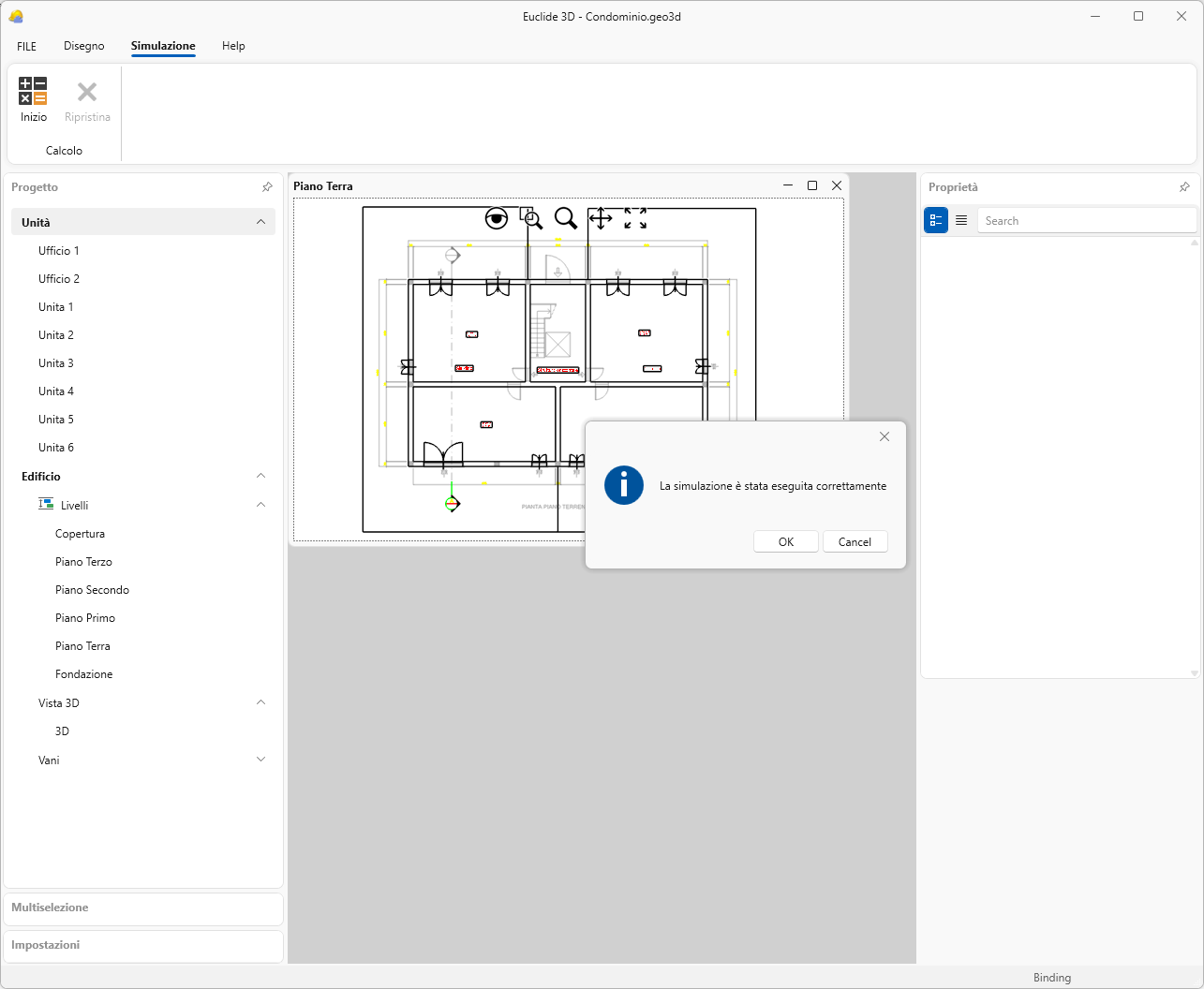 Una volta terminata la creazione della pratica, sarà sufficiente far effettuare al software il calcolo. È possibile effettuare la seguente operazione dalla sezione Simulazione | Calcolo | Inizio.