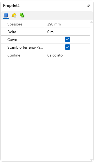 Spessore: indica lo spessore totale dell'elemento (ad esempio una parete, un solaio, ecc...)Delta: rappresenta uno scostamento o un offset rispetto alla posizione di riferimento dell'elementoCurvo: spuntando sul seguente flag l'elemento seguirà una geometria curva invece che lineareScambio Terreno-Pavimento: spuntando sul seguente flag il software gestirà la priorità di intersezione tra l'elemento e il terrenoConfine: consente di definire il confine