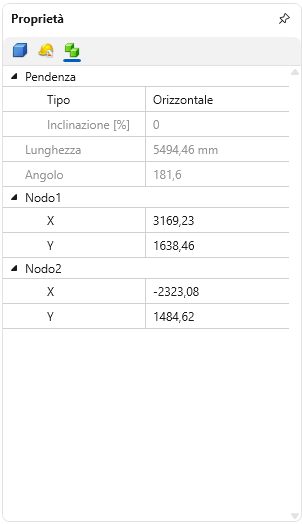 Nella terza sezione del Pannello Proprietà è possibile effettuare il controllo numerico e parametrico della geometria dell'elemento, definendone posizione, sviluppo, orientamento e comportamento altimetrico attraverso la gestione della linea generatrice e dei suoi nodi.