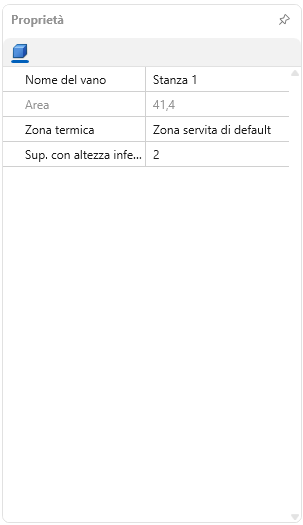 In questa sezione del Pannello Proprietà è possibile modificare il nome del vano e, tramite il campo Sup. con altezza inferiore a 1,5, indicare i metri quadrati da detrarre dalla superficie utile.