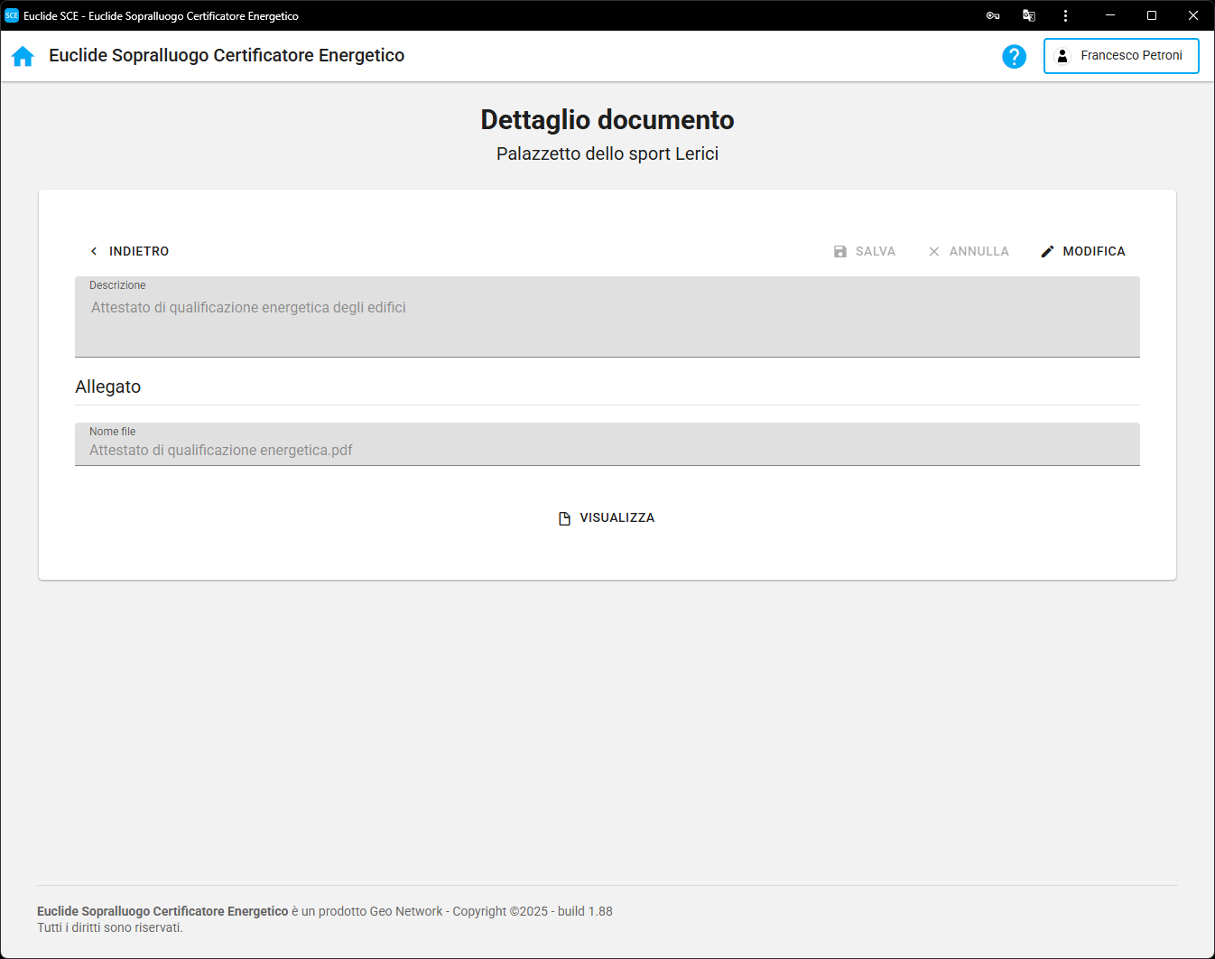 | Permette di allegare al record un documento in formato .doc, .docx, .xls, .xlsx, .txt e .pdf. È possibile, inoltre, allegare i file proprietari generati dal software Geo Network Euclide Certificazione Energetica | |