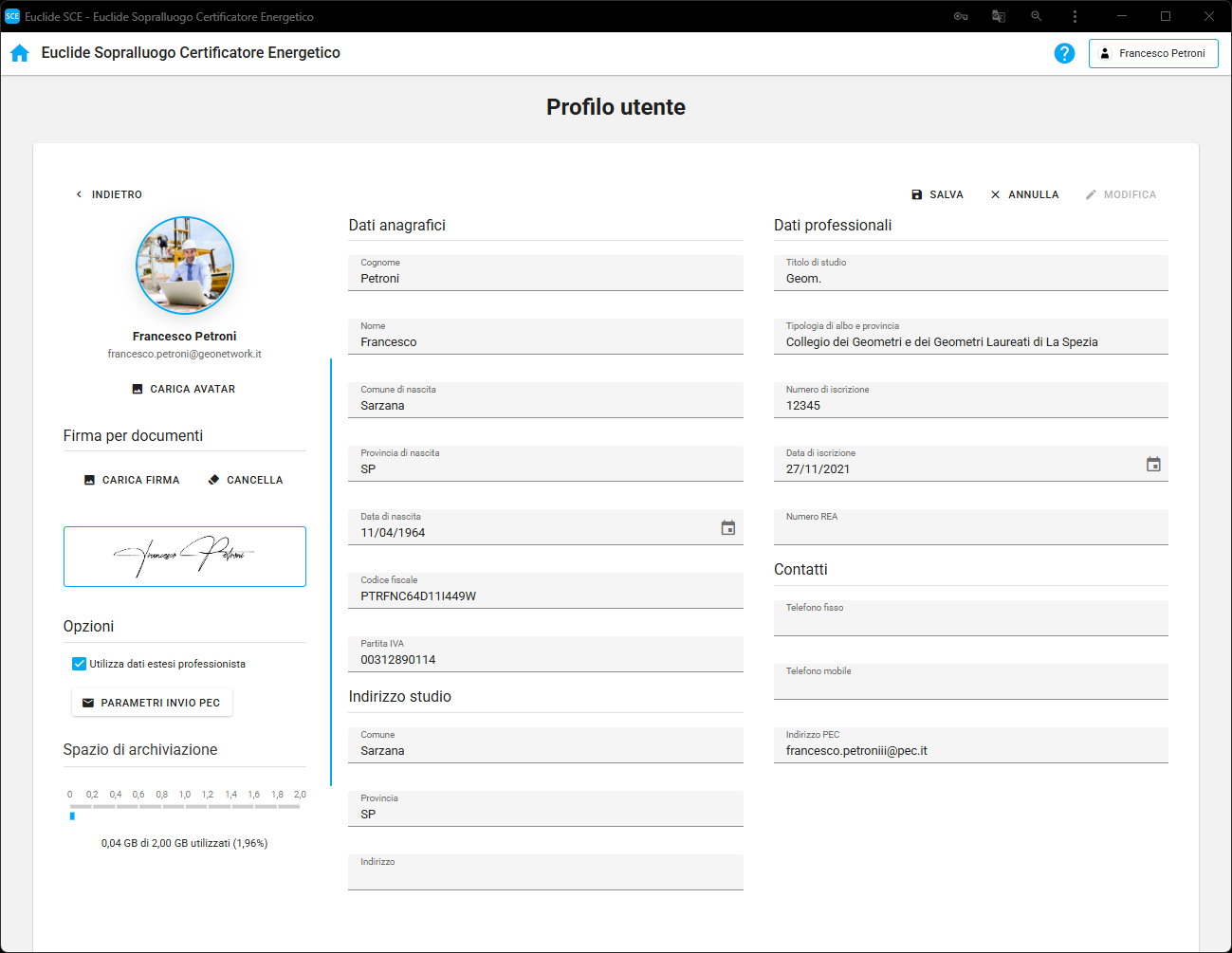 Questa sezione mostra una panoramica completa dei dati identificativi, professionali e di contatto dell'utente attualmente connesso a Euclide SCE.