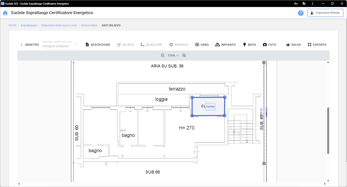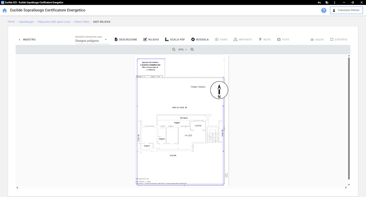 Se come Modalità di rilevamento del vano, si seleziona l'opzione Disegna poligono, il sistema permette di calcolare automaticamente la lunghezza e l'orientamento delle pareti, oltre alla superficie del vano.