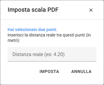 La funzione Scala PDF consente di impostare correttamente il fattore di scala. Per utilizzarla, è necessario selezionare due punti di cui si conosce la distanza reale, inserire il valore corrispondente e confermare tramite il comando Imposta.