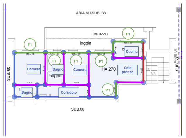 Qualora siano state inserite porte o finestre, queste verranno rappresentate tramite apposite etichette identificative: ad esempio, le finestre saranno indicate con sigle come “F1”.