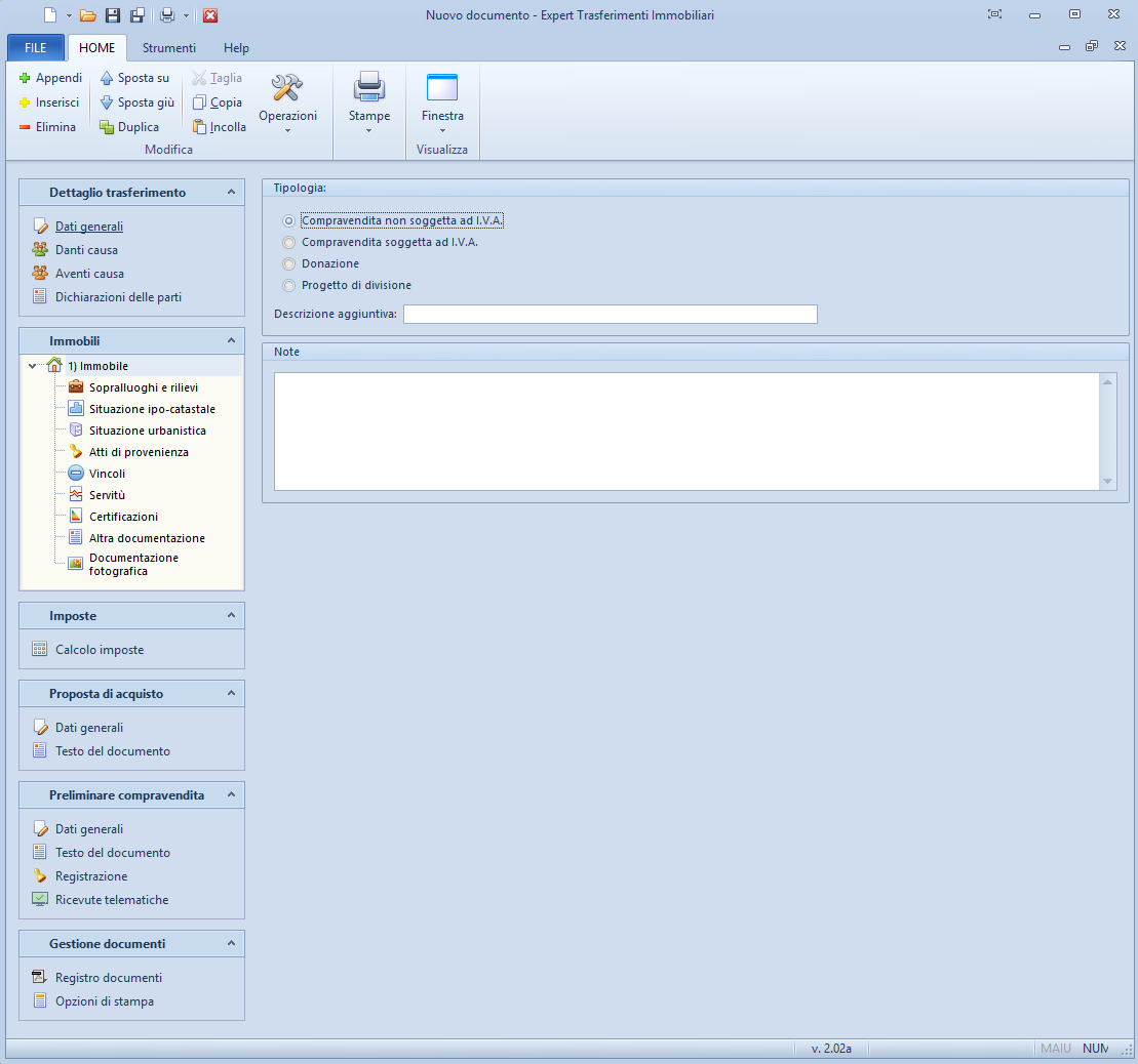 Da questa pagina è possibile definire la tipologia di trasferimento (Compravendita non soggetta a IVA, Compravendita soggetta a IVA, Donazione o Progetto di divisione). È anche possibile inserire una descrizione aggiuntiva ed eventuali note.