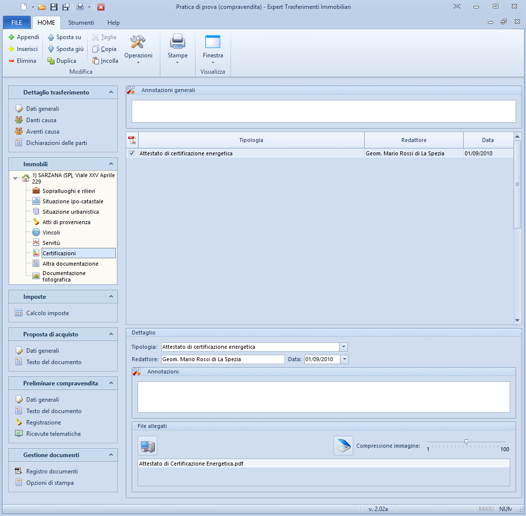 è possibile inserire tutti i dati relativi a diverse tipologie di certificazioni relative all'immobile oggetto del trasferimento, in particolare: