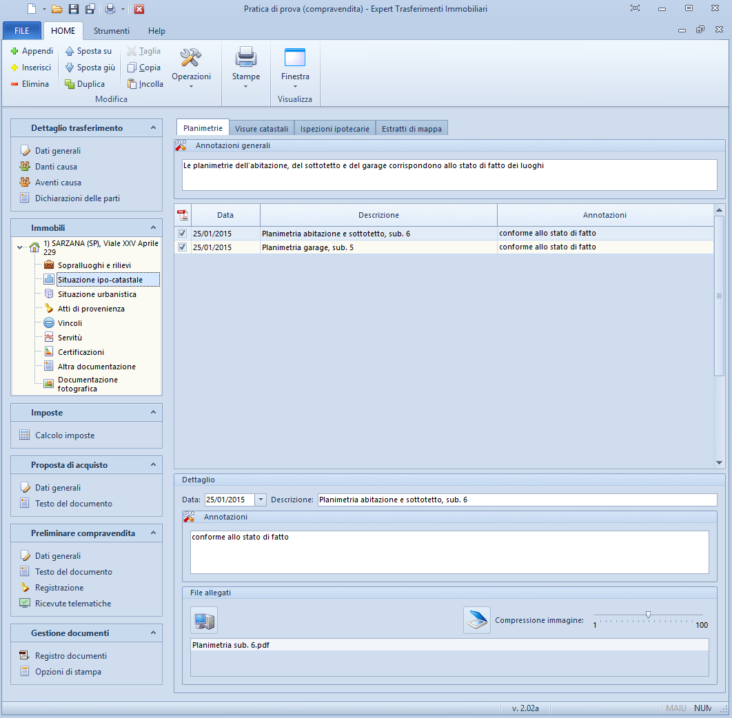 è possibile inserire i dati relativi a planimetrie, visure catastali, ispezioni ipotecarie ed estratti di mappa dell'immobile oggetto del trasferimento.