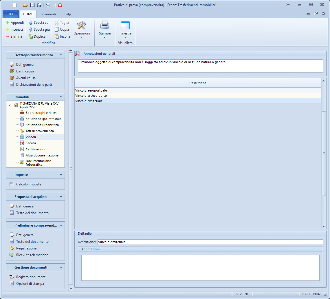 è possibile inserire i dati relativi alle diverse tipologie di vincoli di cui è soggetto l'immobile.