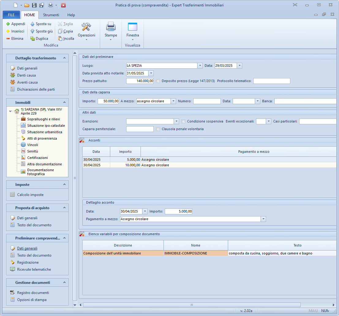 : permette di registrare i pagamenti effettuati a titolo di acconto sul prezzo, con indicazione di data, importo e mezzo di pagamento. Gli importi registrati confluiscono nel totale versato dall'acquirente.Dettaglio acconto