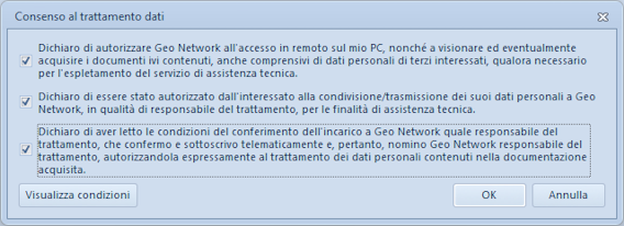 permette di avviare una connessione sicura con Geo Network, comunicando il proprio ID e consentendo il collegamento al proprio desktop per risolvere eventuali problemi riscontrati con il software.