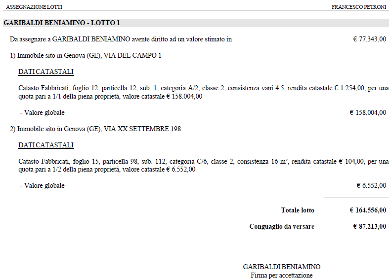 Sarà possibile per tutti o per singolo soggetto visualizzare una descrizione, i dati catastali dei beni, il valore totale del lotto e l'eventuale conguaglio da versare.