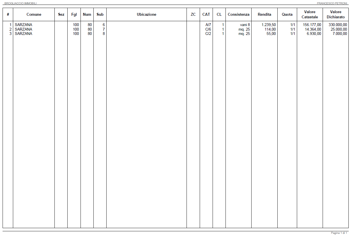 La funzione permette di generare un report relativo ai dati catastali dell'immobile oggetto di trasferimento e le relative quote di possesso