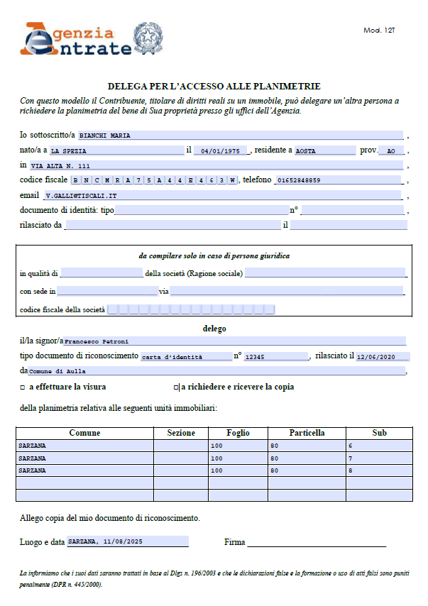 La funzione permette di comporre in formato PDF la delega per l'accesso alle planimetrie.