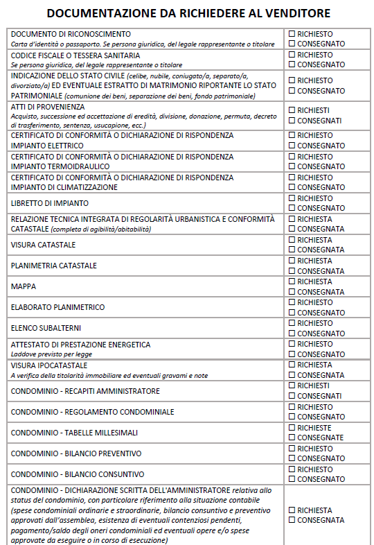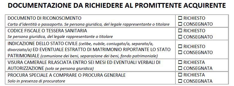 La funzione permette di stampare un promemoria relativo alla documentazione da richiedere al venditore e al promittente acquirente.