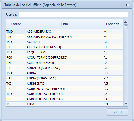 La Tabella dei codici ufficio contiene tutti i codici degli uffici dell'Agenzia delle Entrate disposti nella tabella in ordine alfabetico. È possibile inserire o eliminare nuovi elementi utilizzando il tasto destro del mouse all'interno del relativo riquadro della maschera.