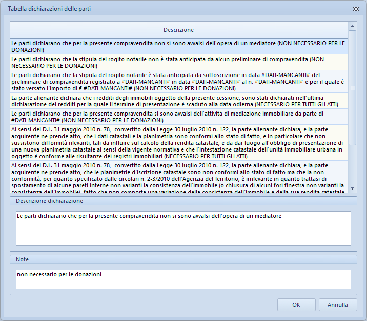 La Tabella contiene le dichiarazioni delle parti memorizzate nel sistema e richiamabili durante la compilazione della pratica dalla relativa sezione Dichiarazioni delle parti. È possibile inserire o eliminare nuovi elementi utilizzando il tasto destro del mouse all'interno del relativo riquadro della maschera.