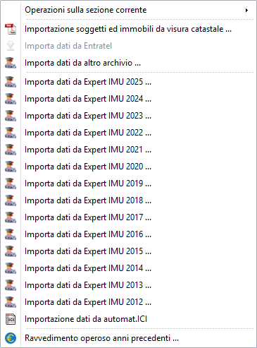 Expert IMU consente di importare l'archivio dati di Expert IMU a partire dall'anno 2012 fino all'anno 2024, tramite la funzione Operazioni | Importazione dati da Expert IMU.