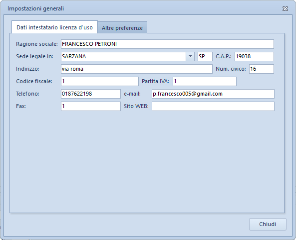 La funzione Strumenti | Impostazioni permette di modificare i dati dell'intestatario della licenza che verranno utilizzati per le stampe ed altre preferenze quali il titolare del trattamento dei dati personali e la frequenza di aggiornamento del programma.