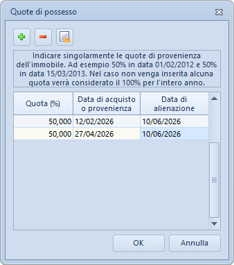 Per la definizione delle quote e dei periodi di possesso è possibile indicare diverse date di acquisto (o, in generale, di provenienza) o di vendita. Così facendo è possibile gestire situazioni complesse come, ad esempio: