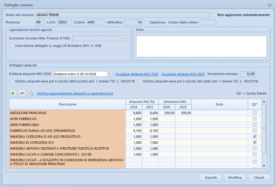 Expert IMU è costantemente aggiornato con le aliquote comunali relative alle delibere che gli stessi comuni pubblicano sul sito dell'Agenzia delle Entrate (nella maggior parte dei casi, non sarà quindi necessario modificare le aliquote ed i relativi parametri presenti nel programma).