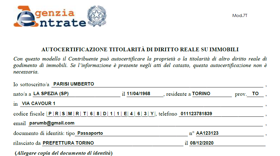 Stampa autocertificazione titolarità di diritto reale su immobili (mod. 7T)