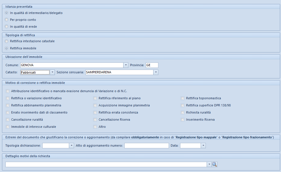 La compilazione dei campi contenuti nella sezione Estremi del documento che giustificano la correzione o aggiornamento è obbligatoria solo in caso di tipologia Registrazione tipo mappale oppure Registrazione tipo di frazionamento.