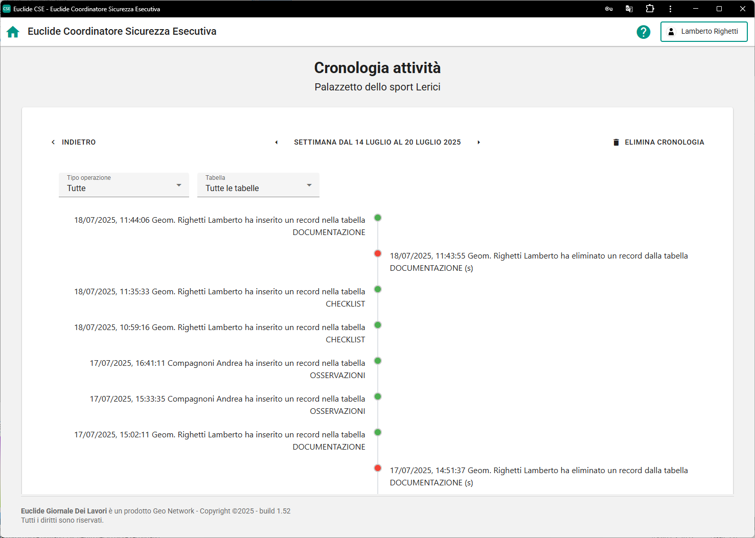 In questa sezione viene visualizzato il registro settimanale di tutte le operazioni effettuate su un determinato cantiere all'interno della piattaforma Euclide Coordinatore Sicurezza Esecutiva. Si tratta di una vera e propria cronologia delle attività, utile per monitorare in modo trasparente e tracciabile le azioni.