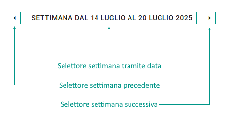 - Periodo di riferimento: attraverso il selettore della settimana, con le frecce è possibile posizionarsi sulla settimana precedente o successiva, premendo invece il pulsante centrale è possibile selezionare una singola data da cui derivare la settimana interessata