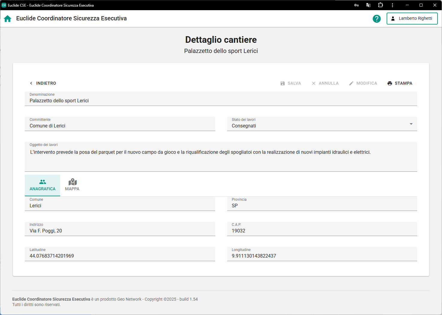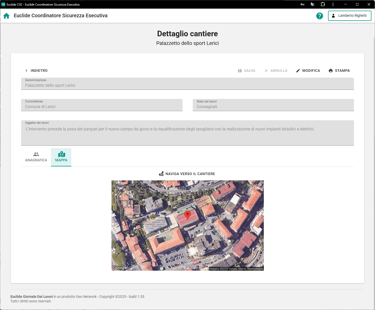 In questa sottosezione, Euclide Coordinatore Sicurezza Esecutiva andrà a scaricare in automatico la mappa aerea in base all'indirizzo del cantiere. Per una maggiore precisione si consiglia di specificare, nell'anagrafica del cantiere, i dati di Latitudine e Longitudine.