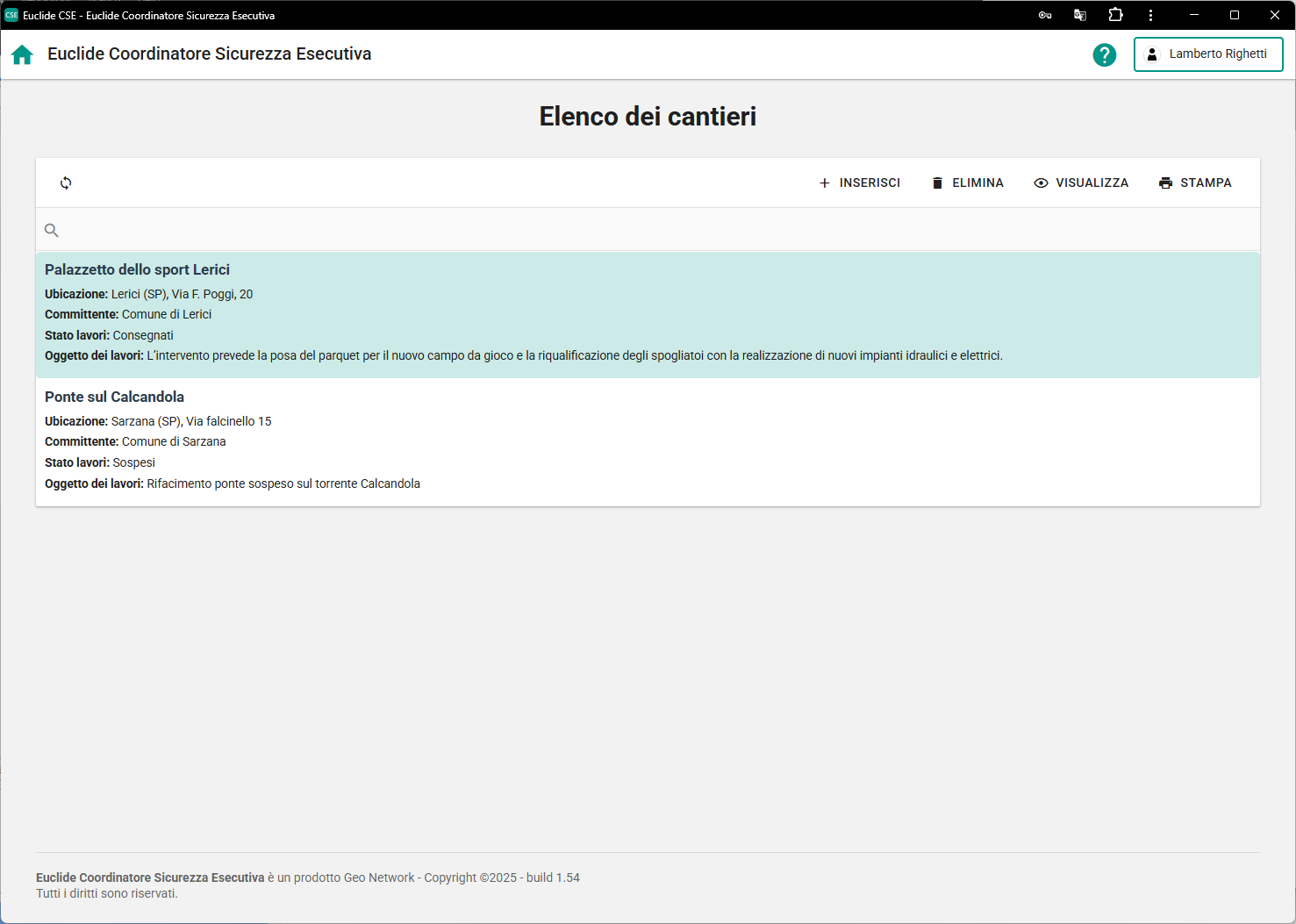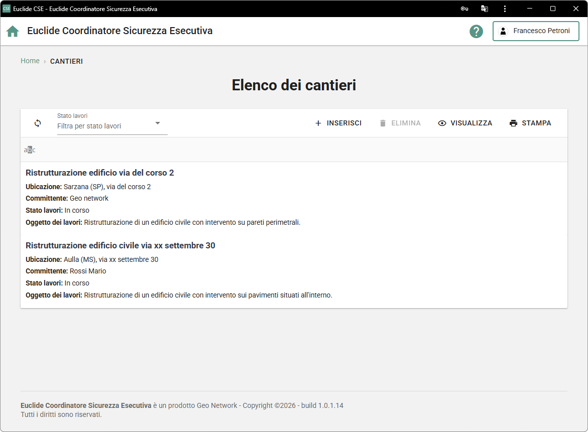 Dopo aver effettuato il login ad Euclide Coordinatore Sicurezza Esecutiva, viene visualizzato l'elenco dei cantieri.