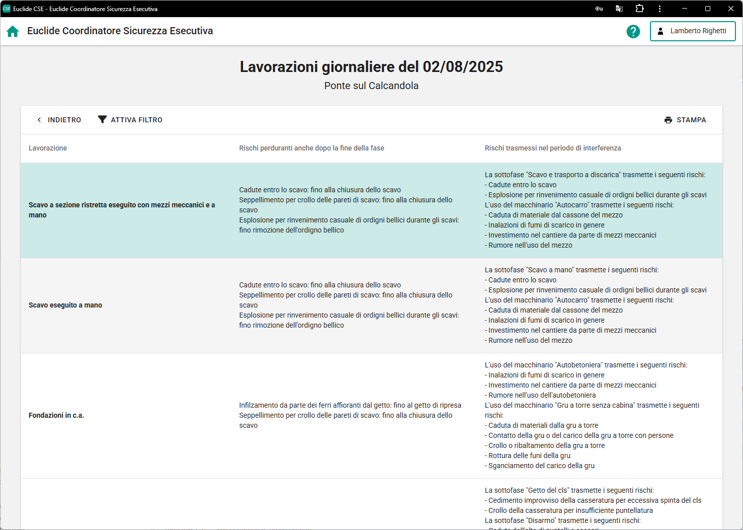 La funzione consente di visualizzare tutte le lavorazioni di cantiere a una data specifica, evidenziando sia i rischi persistenti oltre la conclusione della fase, sia gli eventuali rischi trasmessi durante i periodi di interferenza.