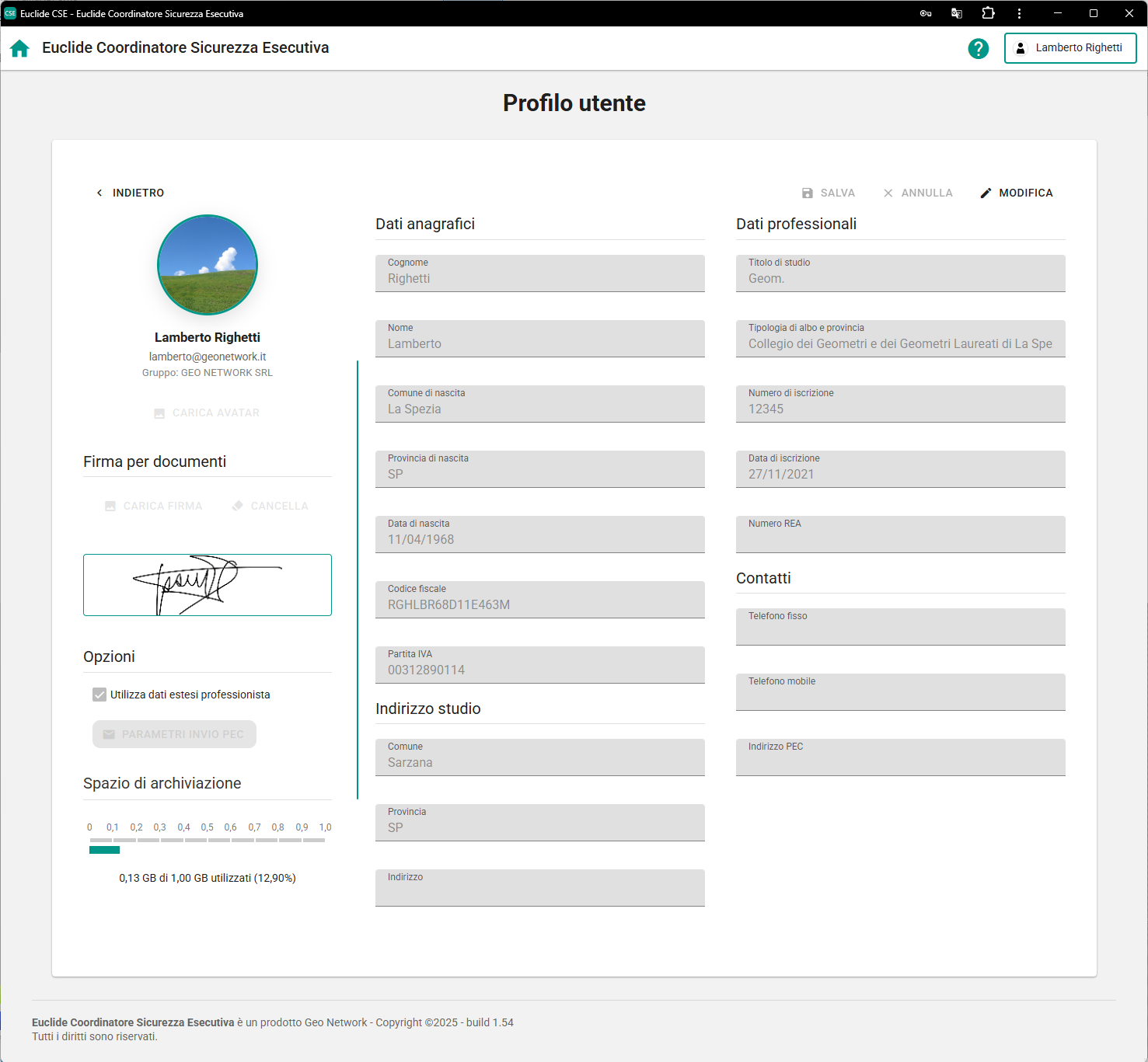 Questa sezione mostra una panoramica completa dei dati identificativi, professionali e di contatto dell'utente attualmente connesso ad Euclide Coordinatore Sicurezza Esecutiva.
