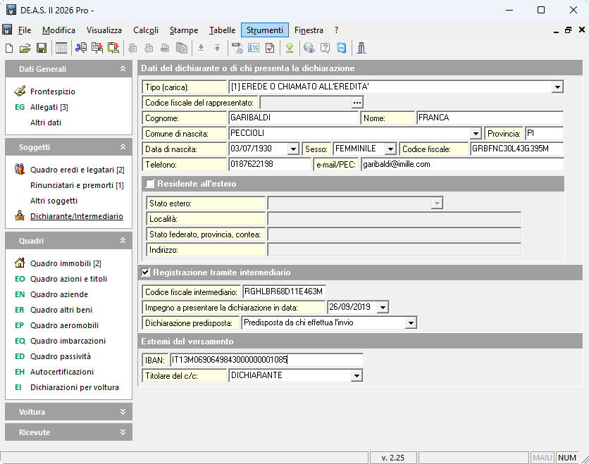 quadro EAo nel quadroAltri soggettiuno dei soggetti presenti è stato contrassegnato come dichiarante, i dati verranno riportati in automatico) - i dati dell'intermediario (se si è provveduto ad inserire tali dati tramite la funzione Tabelle | Tabella dati intermediario essi verranno riportati in automatico)
