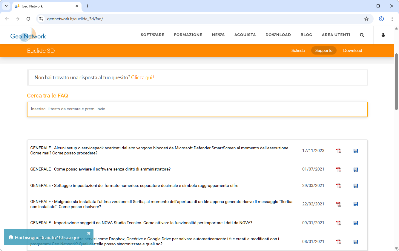 Il pulsante FAQ, presente nella scheda Help, apre la pagina web del sito Geo Network che raccoglie le Frequently Asked Questions, ovvero le domande più frequenti relative al software.