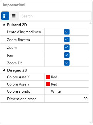 È possibile personalizzare i colore dello sfondo, il colore delle assi X/Y, nascondere o visualizzare i pulsanti di supporto nella vista 2D come la lente di ingrandimento, la finestra di zoom, lo zoom rapido, il pan e lo zoom adattivo.