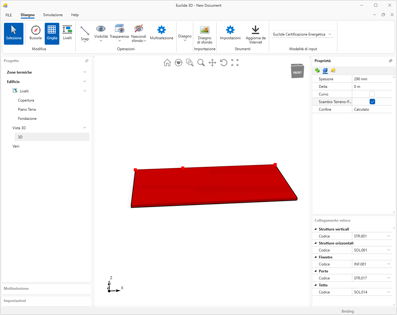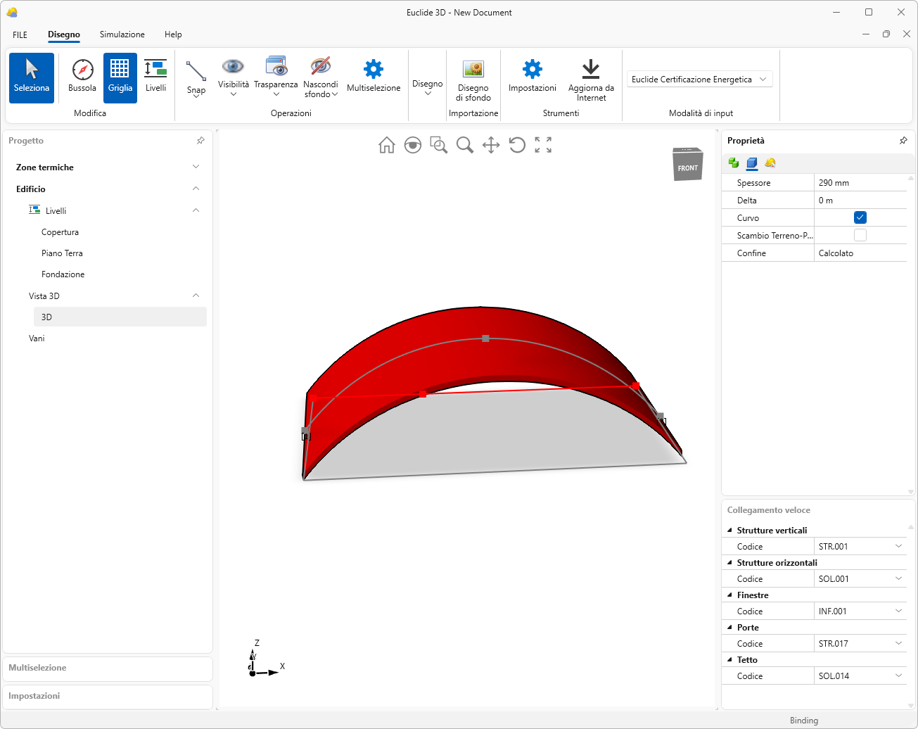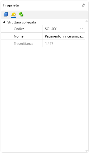 Nella seconda sezione del Pannello Proprietà è possibile, cliccando su Codice, aprire l'archivio di Euclide Certificazione Energetica. Selezionando una struttura dall'elenco e premendo il tasto OK, la struttura verrà assegnata all'elemento selezionato.