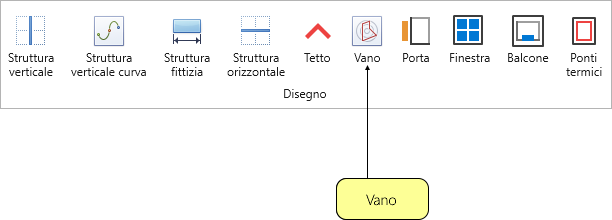 La funzione denominata Vano, accessibile dalla scheda Disegno, permette la creazione di nuovi vani.