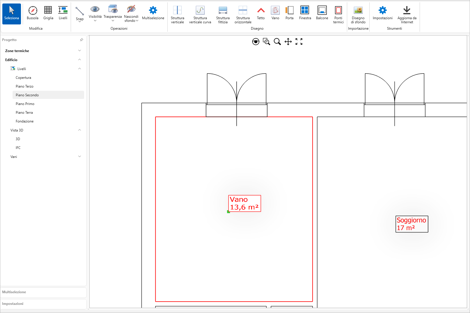 Premendo sul pulsante Vano, sarà possibile identificare i vani presenti all'interno del progetto. Questa funzionalità avviene solamente sulla vista 2D.