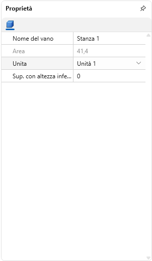 In questa sezione del Pannello Proprietà è possibile modificare il nome del vano e, tramite il campo Sup. con altezza inferiore a 1,5, indicare i metri quadrati da detrarre dalla superficie utile.