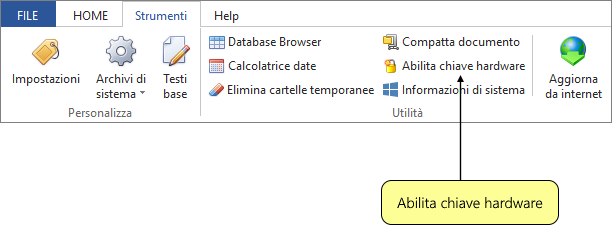La funzione Abilita chiave hardware, accessibile dal menu principale Strumenti, consente di abilitare la chiave hardware direttamente dal programma, qualora sia già installato ed abilitato un altro software della suite Euclide che utilizza la stessa tipologia di chiave.