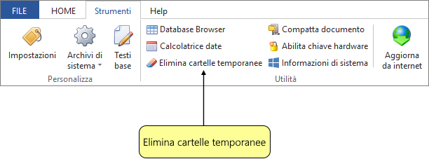 La funzione Elimina cartelle temporanee, accessibile dal menu principale Strumenti, permette di eliminare il contenuto della cartella temporanea di Euclide Certificazione Energetica (solitamente C:\geonet\EuclideCertificazione\TEMP).